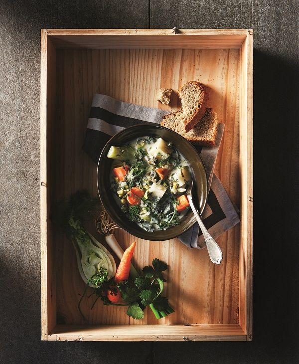 Φρικασέ με γαρίδες, σταμναγκάθι και μυρωδικά. Γαρίδες και χόρτα: μια τολμηρή συνύπαρξη μέσα στην αγκαλιά βελούδινου αβγολέμονου.