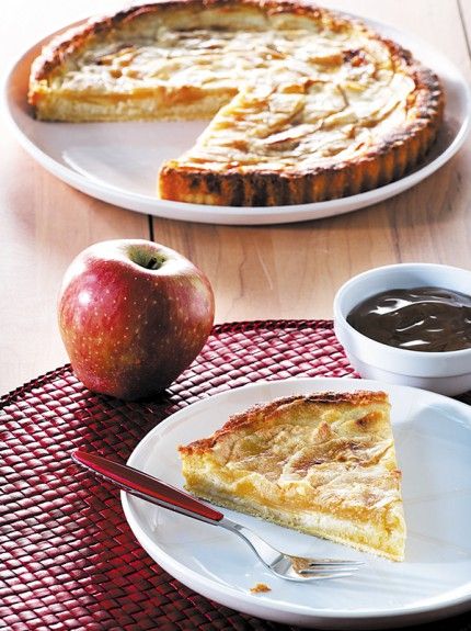 Μια απίστευτα λαχταριστή τάρτα μήλου με αφράτη κρέμα αμυγδάλου. Συνοδεύετε ιδανικά με μια πλούσια σάλτσα καραμέλας.
