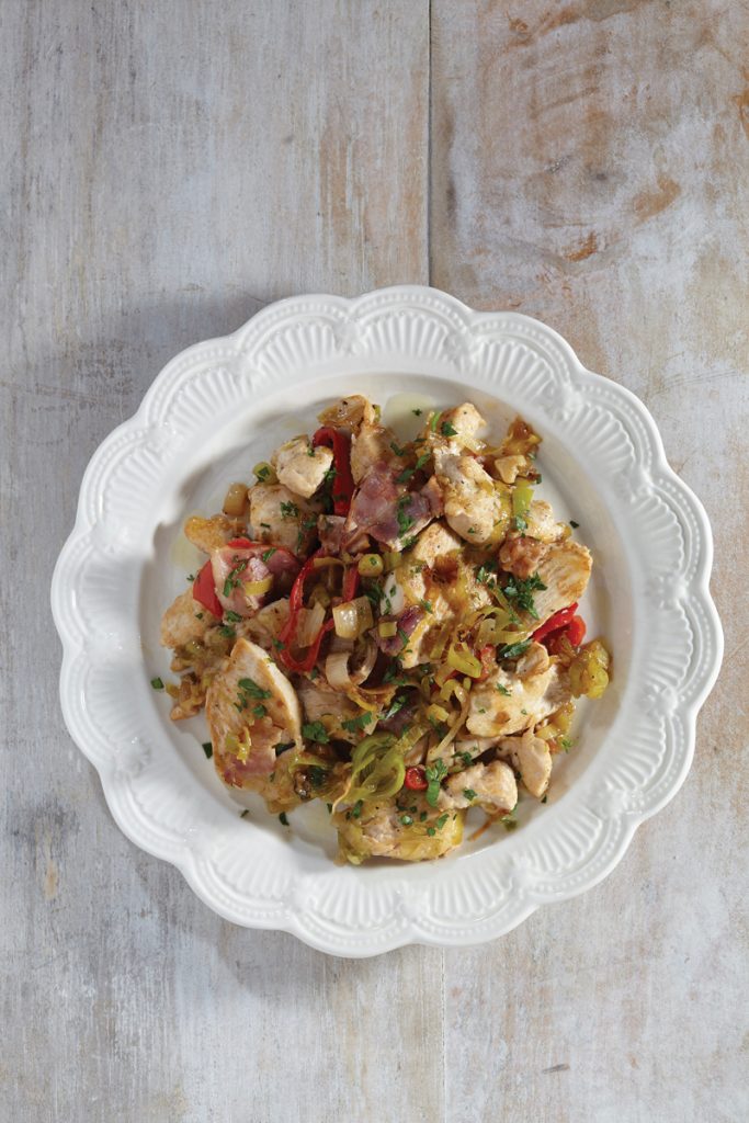 Μια εναλλακτική τηγανιά με πράσο, στήθος κοτόπουλου και μπέικον, που η γεύση της μένει «χαραγμένη».