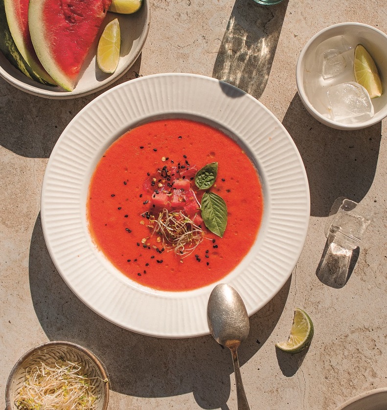 Αναζωογονητική, ο απόλυτα σωστός χαρακτηρισμός για την σούπα γκασπάτσο με καρπούζι. Η ανδαλουσιανή σούπα σε μια από τις πιο λαχταριστές παραλλαγές τώρα που το καρπούζι και οι ντομάτες είναι στα καλύτερά τους!