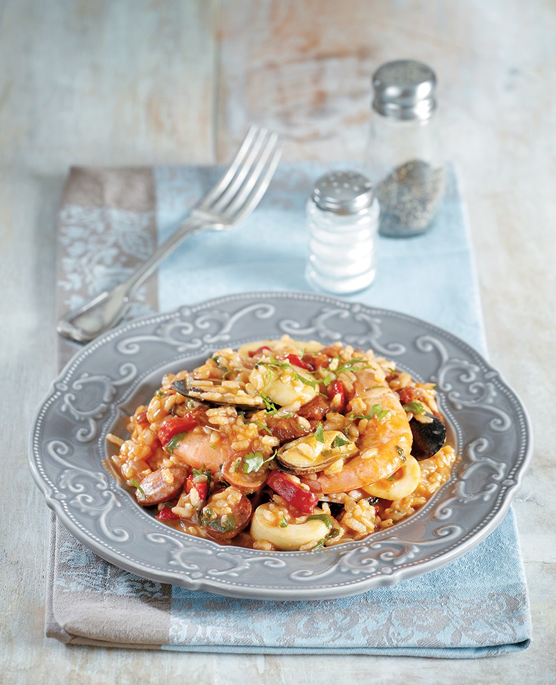 Η παέγια είναι συνταγή που μπορείς να προσθέσεις οτιδήποτε έχεις στο ψυγείο σου. Τη διαφορά σε αυτή τη συνταγή κάνουν οι λιαστές ντομάτες, οι πιπεριές τουρσί και το κοκκινοπίπερο, που δίνουν γλυκιά, ξινή και πικάντικη γεύση.