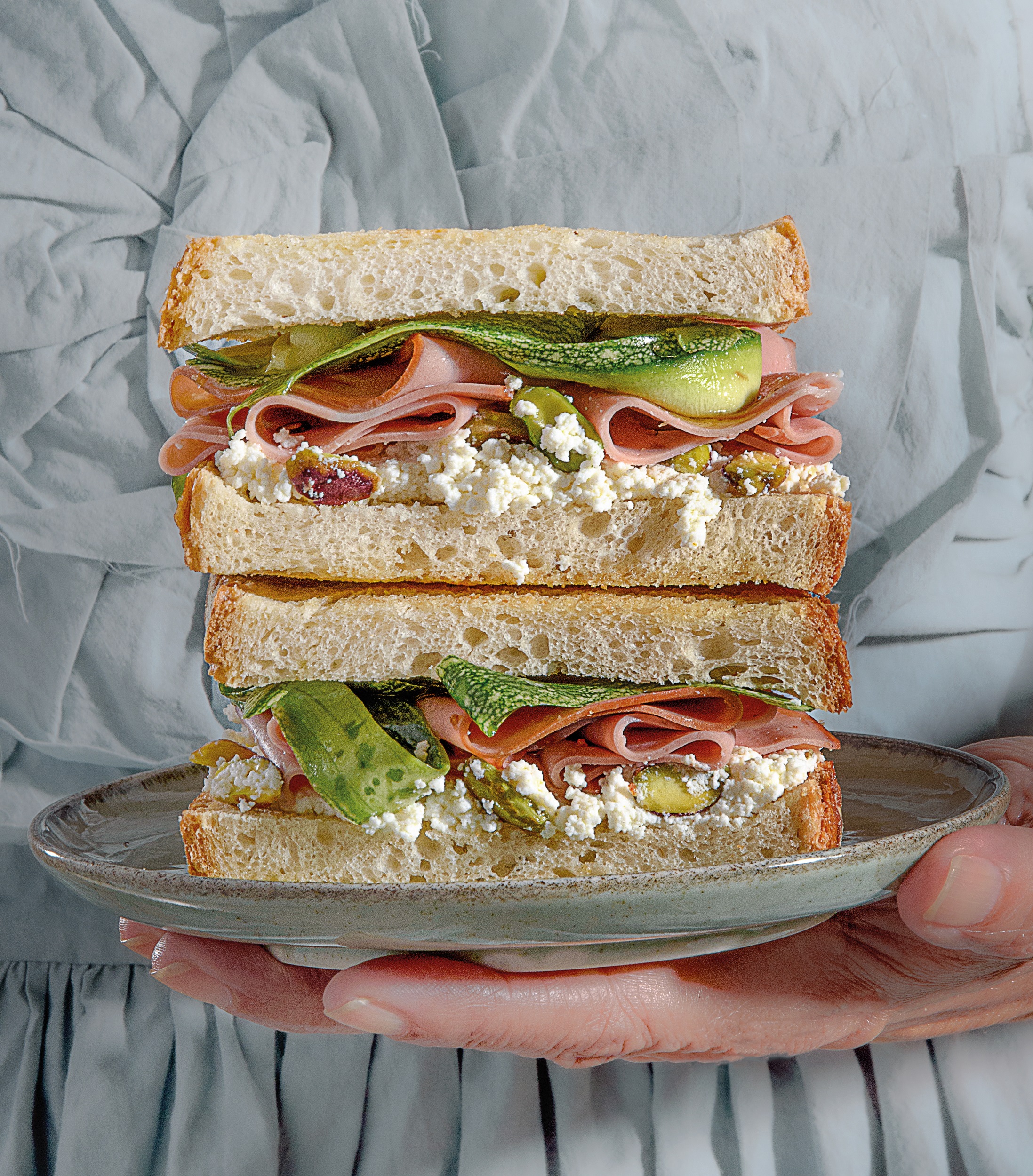Σάντουιτς με προζυμένιο ψωμί, μορταδέλα, κολοκύθι και ξινομυζήθρα