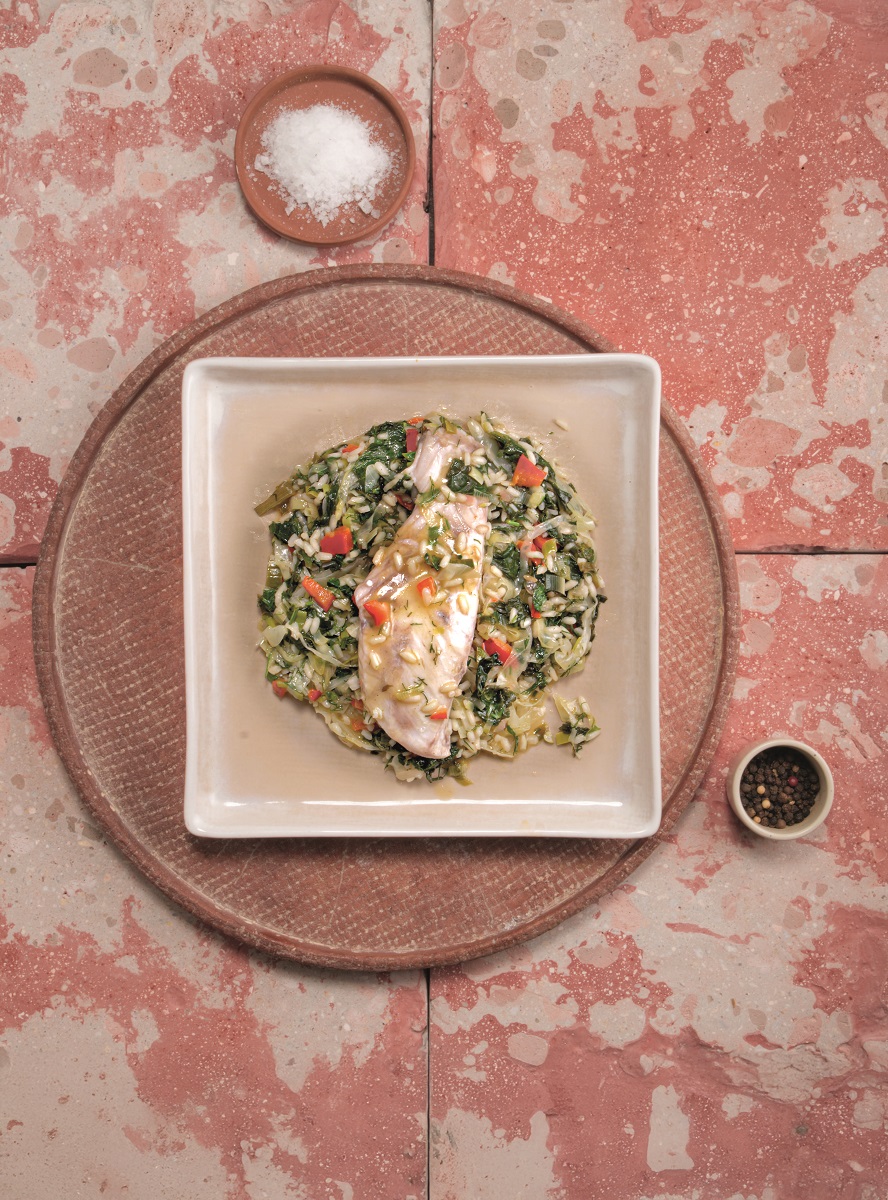 Σπανακολαχανόρυζο με αχνιστό ψάρι