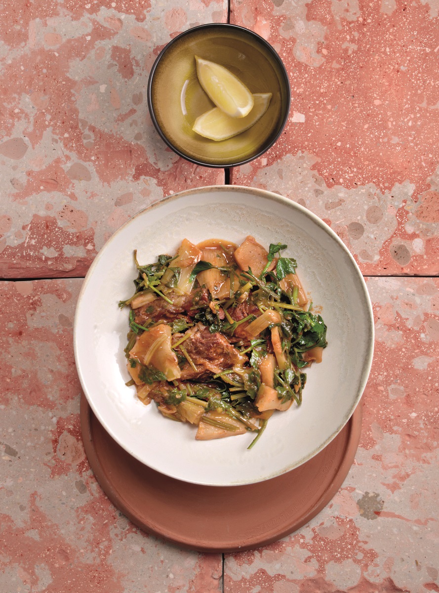 Χοιρινό πρασοσέλινο κοκκινιστό λεμονάτο