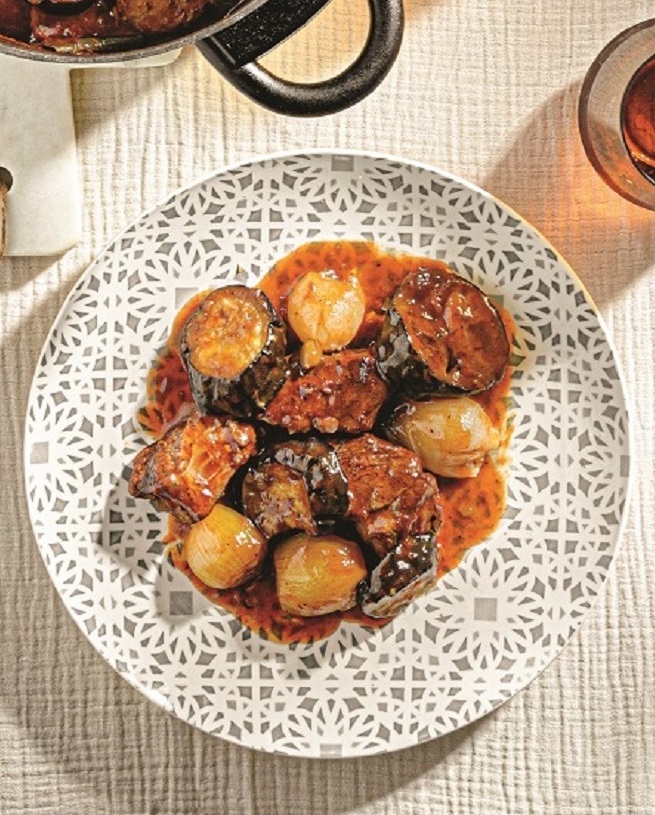 Μοσχάρι με μελιτζάνες, κοκκάρια και καρδάμωμο