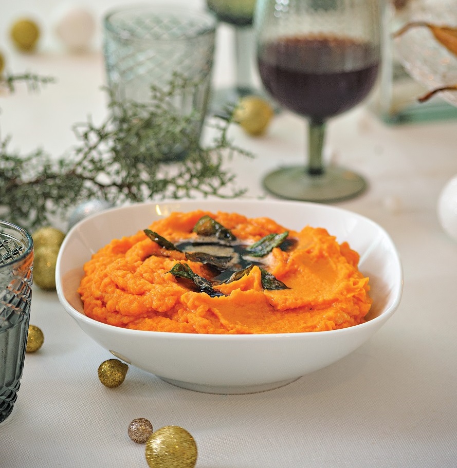 Αυτός ο πουρές γλυκοπατάτας είναι εύκολος στην παρασκευή του και ταυτόχρονα ιδιαίτερα αρωματικός με την προσθήκη του φασκόμηλου στα λίγα συστατικά του. Δοκιμάστε τον ως συνοδευτικό και σε ένα πιο εορταστικό ή Κυριακάτικο τραπέζι.