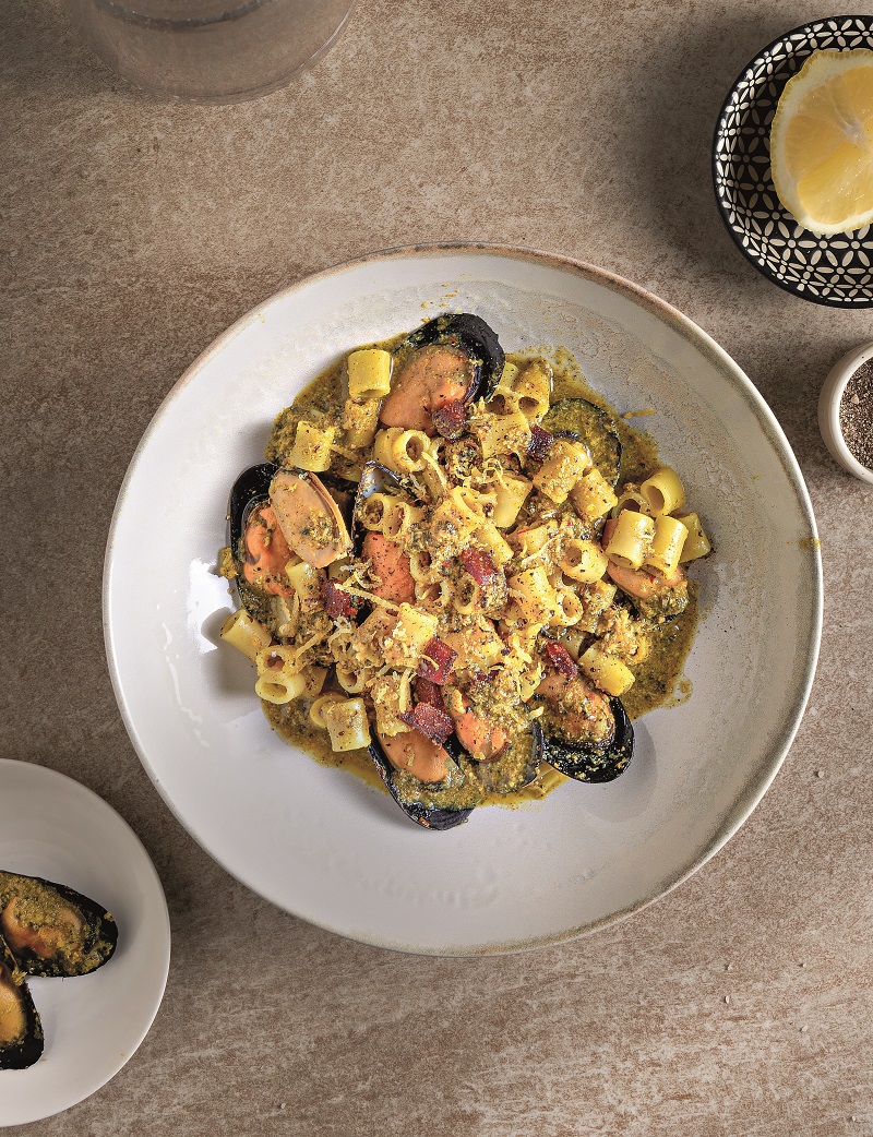 Μακαρονάκι κοφτό με μύδια, αυγοτάραχο και κρόκο Κοζάνης
