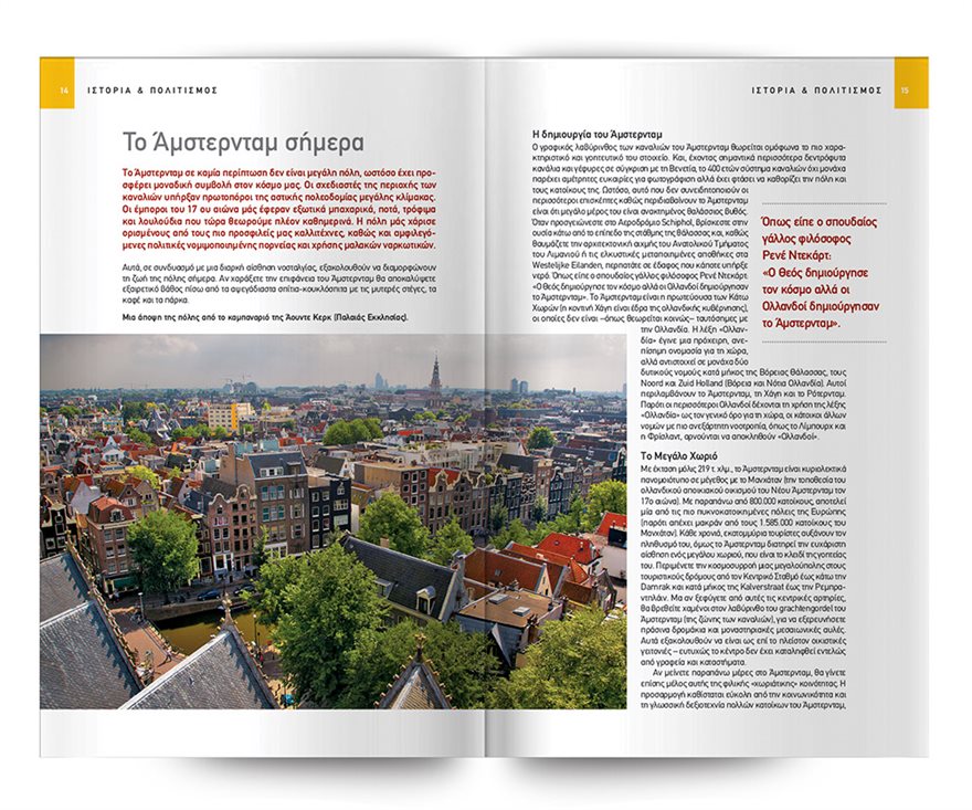 Όλα τα μικρά αλλά πολύτιμα μυστικά της πόλης, όλες τις πληροφορίες που μπορούν να κάνουν τη διαφορά σε ένα ταξίδι στο Άμστερνταμ και δεν θα τις βρει ποτέ κανείς ψάχνοντας στο Διαδίκτυο, περιλαμβάνονται στον οδηγό του National Geographic Traveler. Στις σελίδες του έχουν υπάρχουν συμβουλές και tip από πολύπειρους ταξιδιωτικούς συγγραφείς και περιηγητές, ολοκληρωμένες παρουσιάσεις για τα αξιοθέατα της πόλης και αναλυτικές οδηγίες για βόλτες εντός των τειχών και εκδρομές στην περιφέρεια του Άμστερνταμ. Εννοείται ότι δεν λείπουν οι προτάσεις για φαγητό, ποτό, διασκέδαση, καθώς και κείμενα μύησης στην ιδιαίτερη κουλτούρα της πόλης.