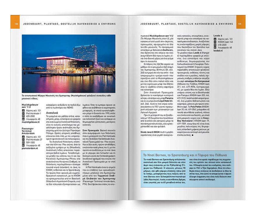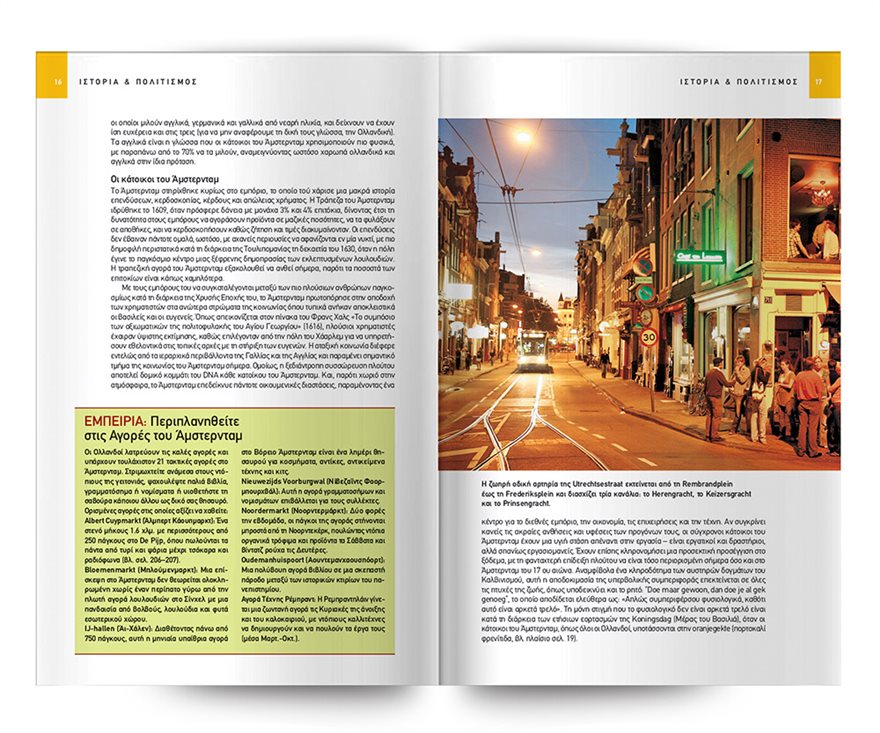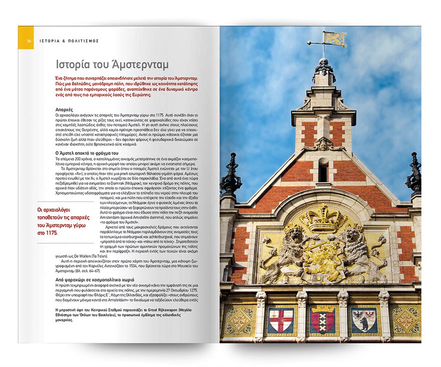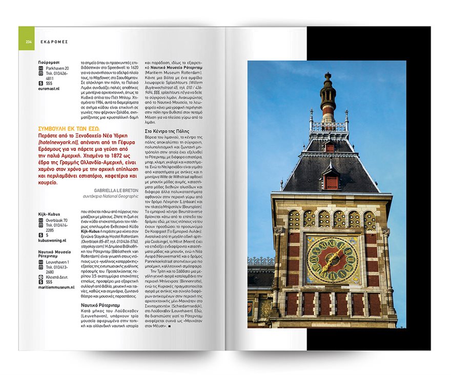 Όλα τα μικρά αλλά πολύτιμα μυστικά της πόλης, όλες τις πληροφορίες που μπορούν να κάνουν τη διαφορά σε ένα ταξίδι στο Άμστερνταμ και δεν θα τις βρει ποτέ κανείς ψάχνοντας στο Διαδίκτυο, περιλαμβάνονται στον οδηγό του National Geographic Traveler. Στις σελίδες του έχουν υπάρχουν συμβουλές και tip από πολύπειρους ταξιδιωτικούς συγγραφείς και περιηγητές, ολοκληρωμένες παρουσιάσεις για τα αξιοθέατα της πόλης και αναλυτικές οδηγίες για βόλτες εντός των τειχών και εκδρομές στην περιφέρεια του Άμστερνταμ. Εννοείται ότι δεν λείπουν οι προτάσεις για φαγητό, ποτό, διασκέδαση, καθώς και κείμενα μύησης στην ιδιαίτερη κουλτούρα της πόλης.