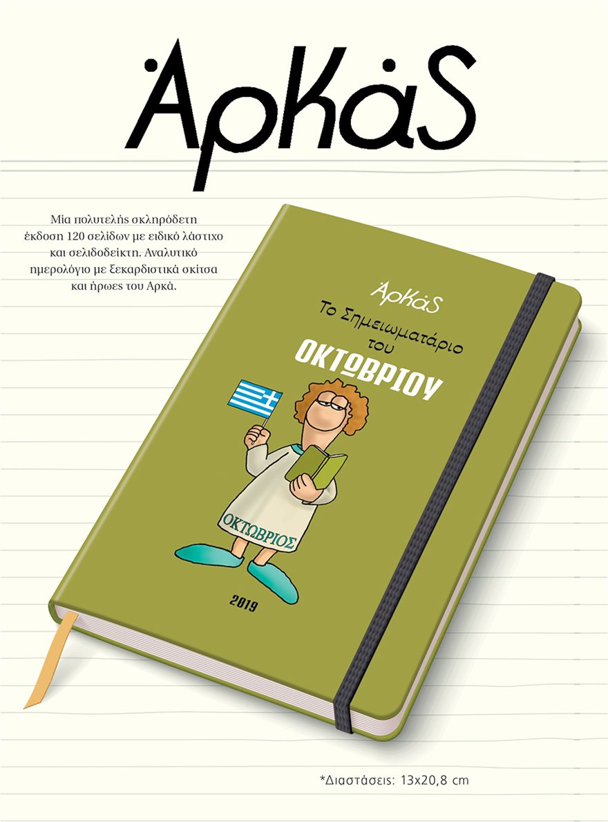 Αυτή την Κυριακή με το ΘΕΜΑ, το πολυτελές σκληρόδετο σημειωματάριο-ημερολόγιο Οκτωβρίου με τα σπαρταριστά σκίτσα του αγαπημένου μας Αρκά είναι στο ΘΕΜΑ. Πρόκειται για μία πολυτελή σκληρόδετη έκδοση -μία για κάθε μήνα- με 120 σελίδες και με ειδικό λάστιχο και σελιδοδείκτη, που σας δίνει τη δυνατότητα να…τα γράφετε όλα. Κάθε μηνιαίο σημειωματάριο περιλαμβάνει ημερολόγιο με δύο σελίδες για κάθε μέρα ξεχωριστά καθώς και ξεκαρδιστικά σκίτσα με το χιούμορ και τους ήρωες του κορυφαίου Έλληνα δημιουργού κόμικ, του Αρκά.