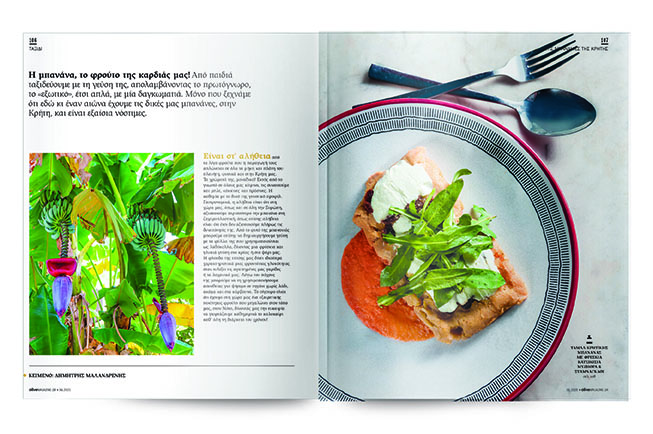 Ταµάλ κρητικής µπανάνας µε κατσικίσια µυζήθρα & σταµναγκάθι, Χοιρινή τηγανιά µε κρητικές µπανάνες & µούσµουλα, Κρητικές µπανάνες µε γαρίδες & απάκι ψηµένες στη φλούδα τους.