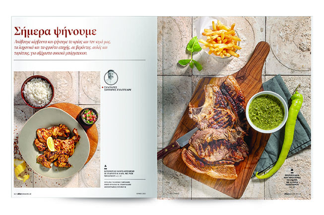 Μαριναρισµένες πανσέτες στη σχάρα µε σπαστές πατάτες, Κοτόπουλο µαριναρισµένο σε γιαούρτι, κάρι, µε ρύζι basmat, Μπριζολάκια από µοσχαράκι γάλακτος µε σάλτσα τσιµιτσούρι, Κεφτεδάκια στη σχάρα µε ψητές πιπεριές & ντοµάτες, Αρνίσια παϊδάκια στη σχάρα µε σαλάτα φαγόπυρου.