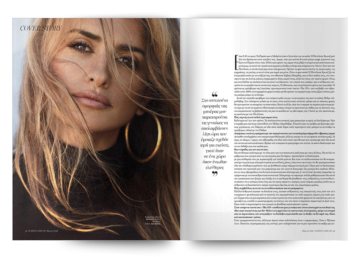 Στο εξώφυλλο η Πενέλοπε Κρουζ, προχωράει από το ένα κινηματογραφικό project στο επόμενο, κρατά το γάμο της με τον Χαβιέ Μπαρδέμ μακριά από τη δημοσιότητα, ενώ στον ελεύθερο χρόνο της αγωνίζεται ενάντια στον αναλφαβητισμό και τη σεξουαλική κακοποίηση των κοριτσιών του κόσμου.