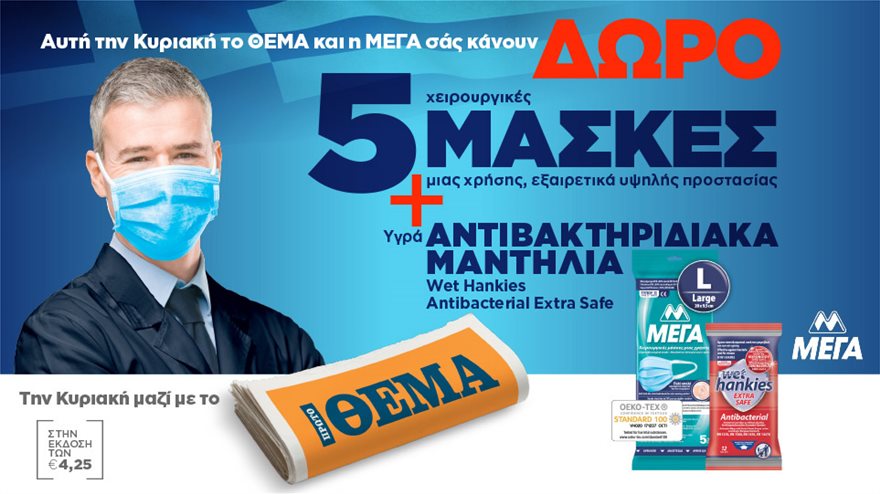 Επειδή η υγεία όλων μας είναι το πολυτιμότερο αγαθό, αυτή την Κυριακή το ΠΡΩΤΟ ΘΕΜΑ και η ΜΕΓΑ, σας κάνουν δώρο, στην έκδοση με τις προσφορές (4,25€), μία συσκευασία με πέντε (5) μάσκες εξαιρετικά υψηλής προστασίας, σχεδιασμένες για την ασφάλειά σας (σε μέγεθος Large) και 1 συσκευασία υγρών αντιβακτηριδιακών μαντηλιών Wet Hankies Antibacterial Extra Safe!