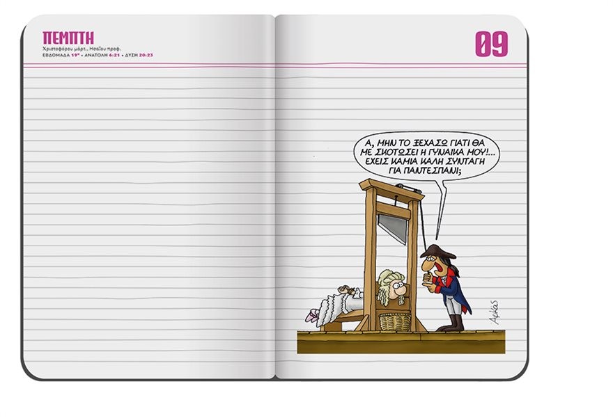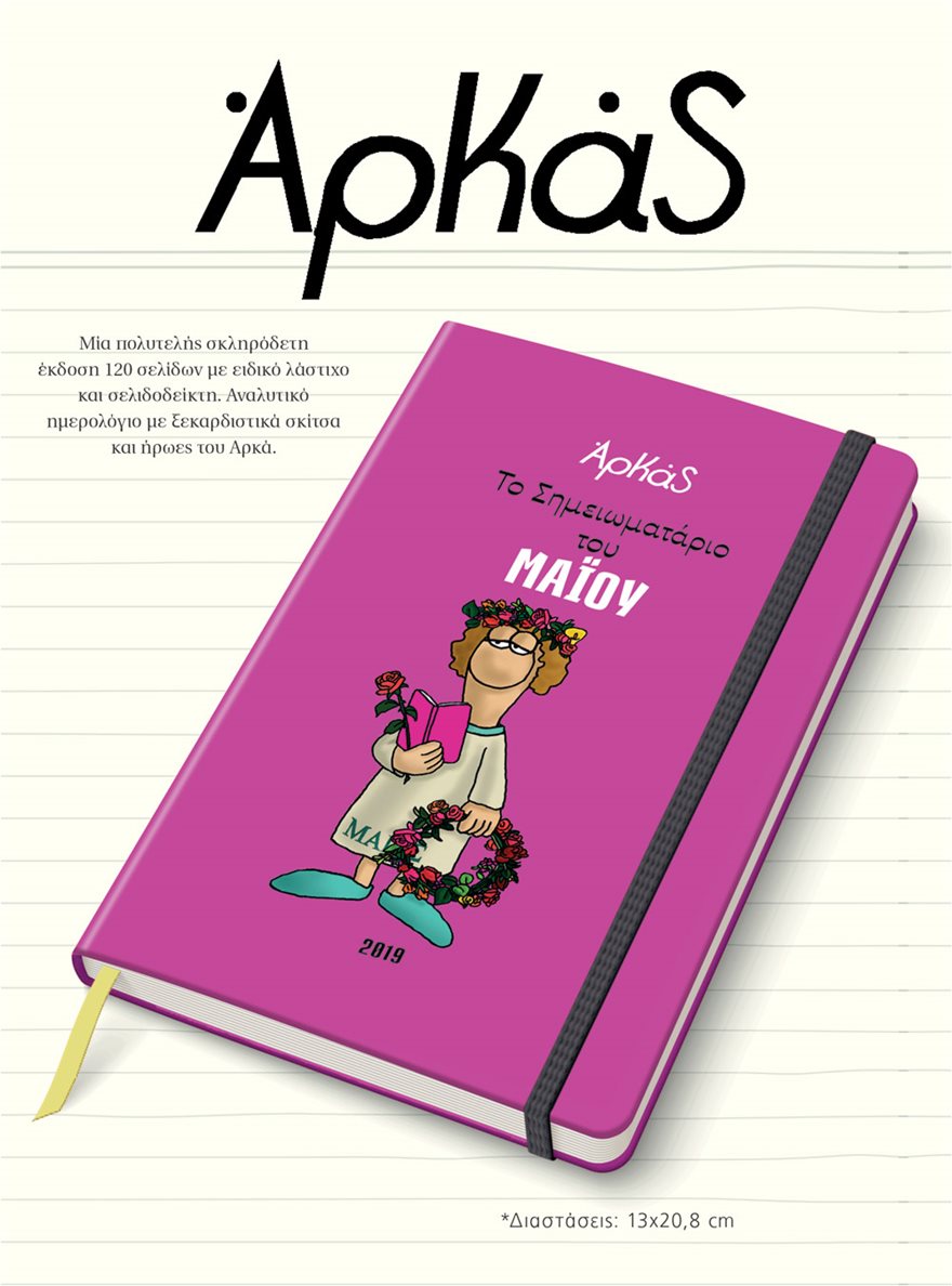 Εκτάκτως το Μεγάλο Σάββατο με το ΘΕΜΑ, το πολυτελές σκληρόδετο σημειωματάριο-ημερολόγιο με τα σπαρταριστά σκίτσα του αγαπημένου μας Αρκά είναι στο ΘΕΜΑ. Πρόκειται για μία πολυτελή σκληρόδετη έκδοση -μία για κάθε μήνα- με 120 σελίδες και με ειδικό λάστιχο και σελιδοδείκτη, που σας δίνει τη δυνατότητα να…τα γράφετε όλα. Κάθε μηνιαίο σημειωματάριο περιλαμβάνει ημερολόγιο με δύο σελίδες για κάθε μέρα ξεχωριστά καθώς και ξεκαρδιστικά σκίτσα με το χιούμορ και τους ήρωες του κορυφαίου Έλληνα δημιουργού κόμικ, του Αρκά.