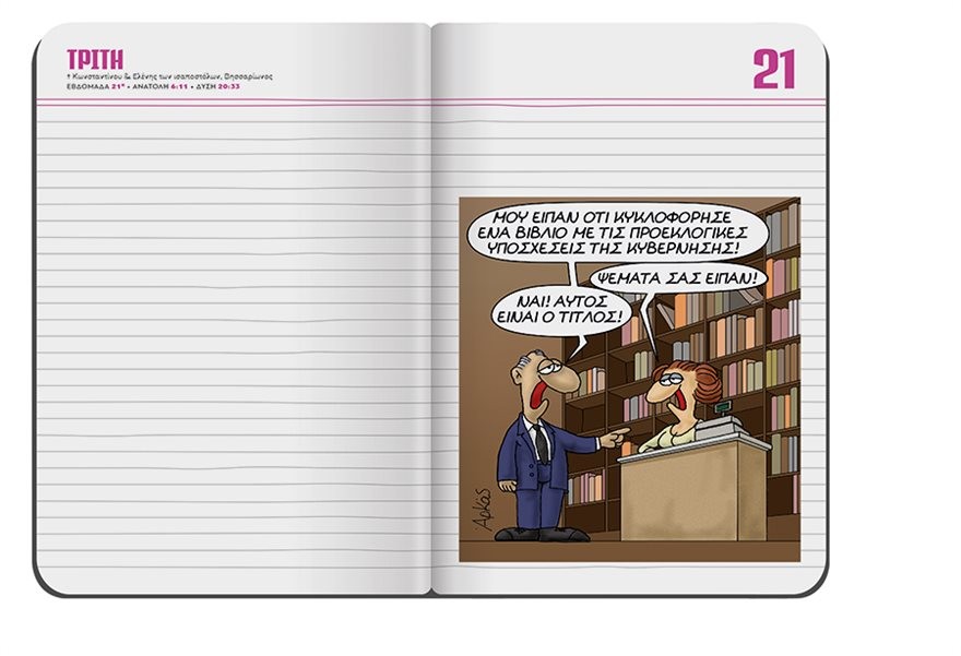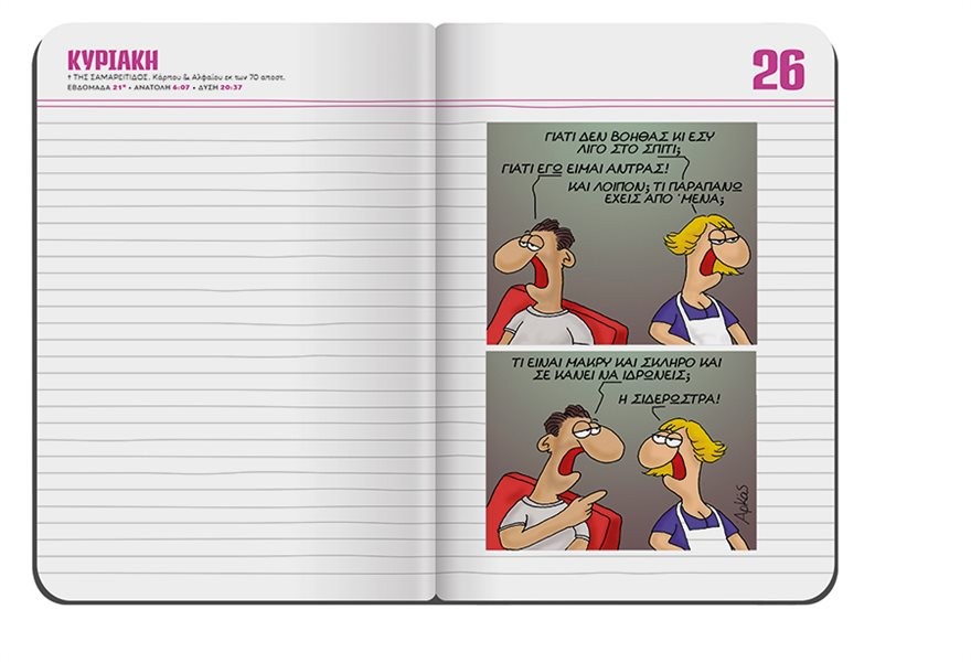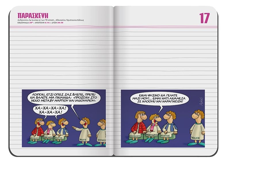 Εκτάκτως το Μεγάλο Σάββατο με το ΘΕΜΑ, το πολυτελές σκληρόδετο σημειωματάριο-ημερολόγιο με τα σπαρταριστά σκίτσα του αγαπημένου μας Αρκά είναι στο ΘΕΜΑ. Πρόκειται για μία πολυτελή σκληρόδετη έκδοση -μία για κάθε μήνα- με 120 σελίδες και με ειδικό λάστιχο και σελιδοδείκτη, που σας δίνει τη δυνατότητα να…τα γράφετε όλα. Κάθε μηνιαίο σημειωματάριο περιλαμβάνει ημερολόγιο με δύο σελίδες για κάθε μέρα ξεχωριστά καθώς και ξεκαρδιστικά σκίτσα με το χιούμορ και τους ήρωες του κορυφαίου Έλληνα δημιουργού κόμικ, του Αρκά.
